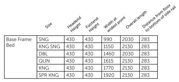 - The base width is flush with the mattress so the mattress sits on the side rail, rather than inside the frame.Distance from the floor to bottom of the side rail is 100mm.