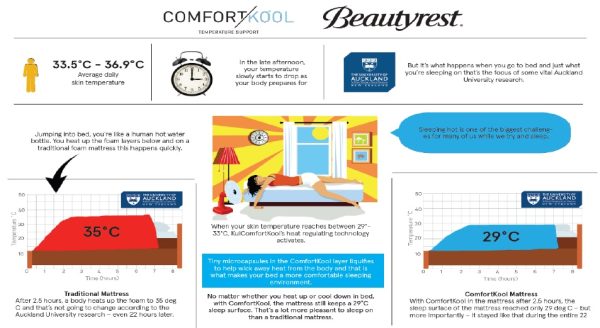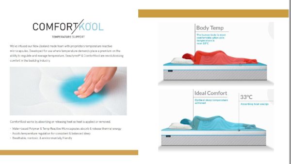 ComfortKool is a water-based, breathable and non-toxic surface infusion we apply to our New Zealand made foam technology that absorbs and releases heat energy to help manage temperature while you sleep.